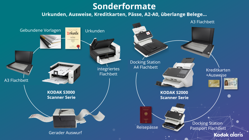 Zum Einsatz kommen Scanner der KODAK S2000w Serie (für den Arbeitsplatz) sowie der KODAK S3000 Serie (für Produktionsumgebungen und zentrale Posteingangsstellen). Beide Modellreihen lassen sich optional mit einer A4- oder A3-Flachbett-Scaneinheit erweitern – ideal zur Erfassung von Urkunden, Ausweisen, gehefteten Dokumenten und ähnlichen Vorlagen. Diese Kombination ist besonders für den Einsatz in verteilten und dezentralen Front-End-Anwendungen geeignet – etwa in Bürgerbüros, Kfz-Zulassungsstellen oder Ausländerbehörden –, wo im direkten Bürgerkontakt unterschiedlichste Dokumententypen digitalisiert werden müssen.
